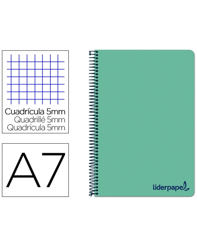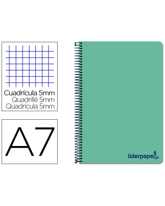 Cuaderno espiral liderpapel a7 micro wonder tapa plastico 100h 90 gr cuadro 5mm 4 bandascolor verde pastel turquesa