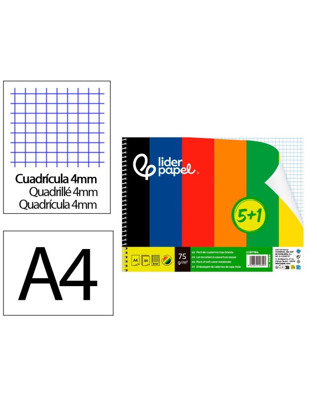 El pack de 6 cuadernos espiral Liderpapel es perfecto para estudiantes y profesionales que valoran la organización y funcionalidad. Cada cuaderno cuenta con una tapa blanda impresa y plastificada en cartoncillo, 80 hojas de papel de 75 gramos con cuadricula de 4mm con margen, idal para tomar notas, hacer esquemas o realizar tareas diarias. Los cuadernos vienen en 6 colores surtidos, añadiendo un toque de variedad y estilo a tus herramientasde estudio o trabajo.