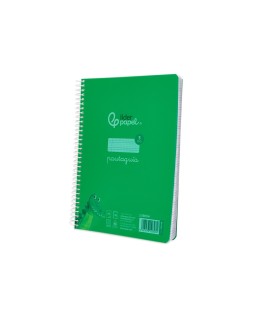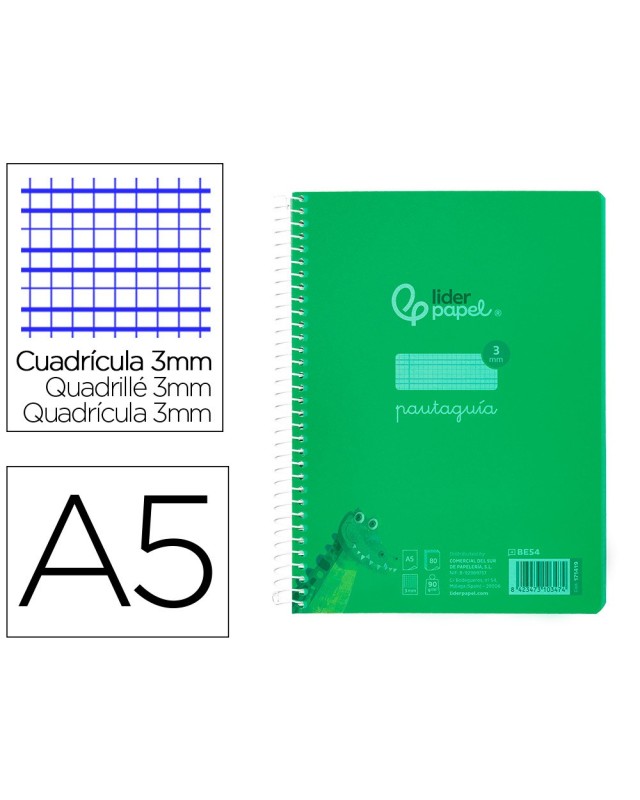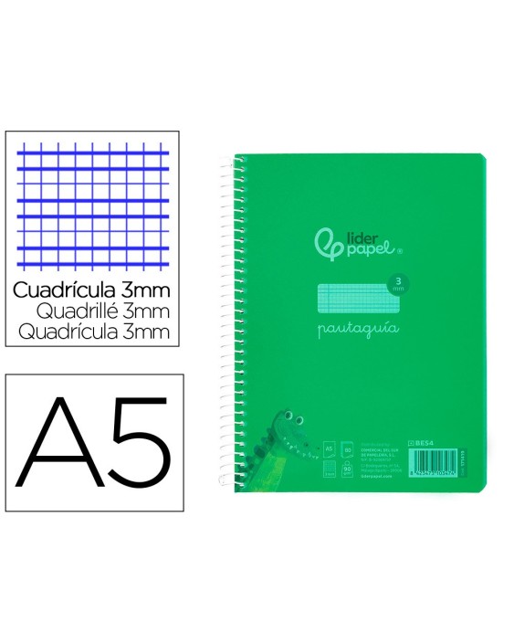 Cuaderno espiral liderpapel a5 pautaguia tapa plastico 80h 90gr cuadro pautado 3 mm con margen color verde