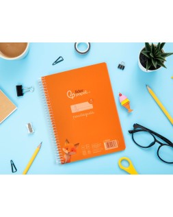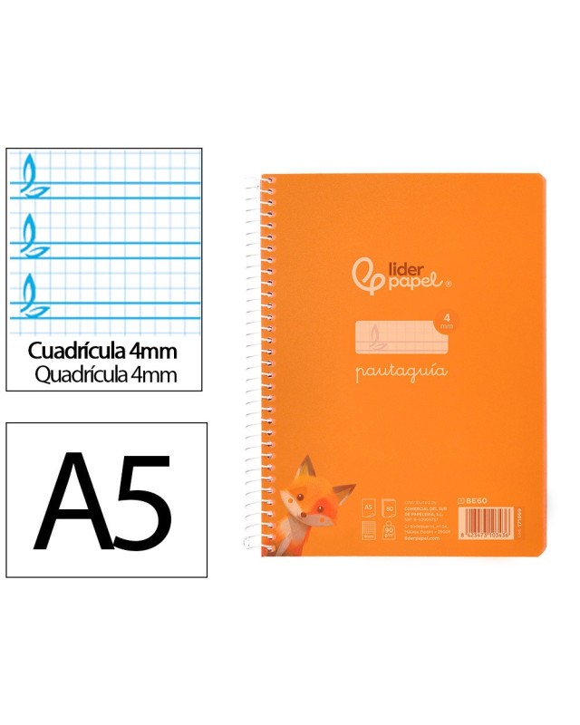Cuaderno espiral liderpapel a5 pautaguia tapa plastico 80h 90gr cuadro pautado 4mm color naranja