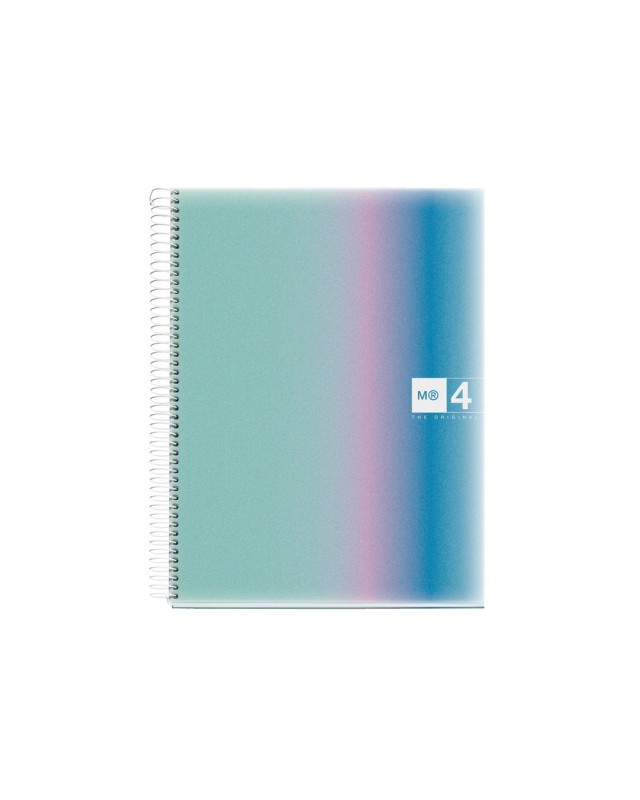 Cuaderno espiral Miquelrius Din A4 (210 x 297 mm). Cubiertas: Polipropileno translúcido impreso de 0,8 mm. Espiral: Metálica continua que permite laapertura en plano del cuaderno, además de dar la vuelta completa, y con c ierre coilock que evita enganches. Papel interior: extra opaco de 70 g/m²,evita que la tinta traspase y seca rápidamente. Hojas: 120 hojas con band a de color en el lateral (4 colores, 30 hojas por color), ideales para poder clasificar apuntes y usar un color para cada asignatura, cabecera para títulos, microperforado para un arranque limpio y 4 taladros para archivar. Rayado: Cuadrícula 5 mm.