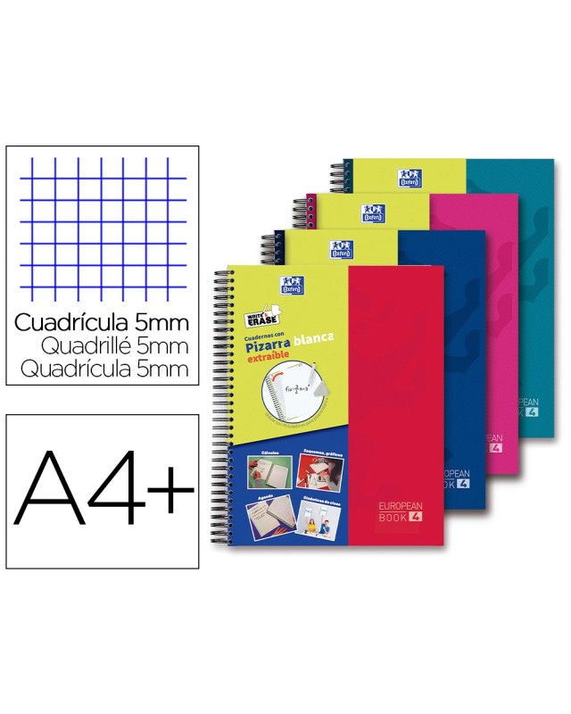 Cuaderno multiasignaturas perfecto para poder organizar por color según las asignaturas o temas. Con 4 colores de recuadro para tener los apuntes y notas siempre organizados. Además, es compatible con la aplicación gratuita Scribzee que permite compartir, organizar y consultar las notas cuando quieras y dónde quieras desde tu smartphone. Con pizarra blanca extraíble y bolsa portahojas. 120 hojas. Tapa extradura. Papel de 90 g/m². Microperforado. Cuadrícula de 5 mm. Con margen. Formato Din A4+. 5 colores surtidos.