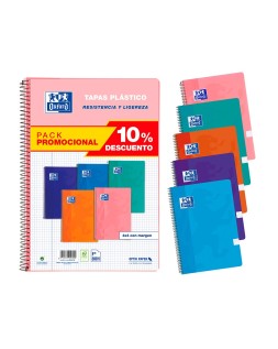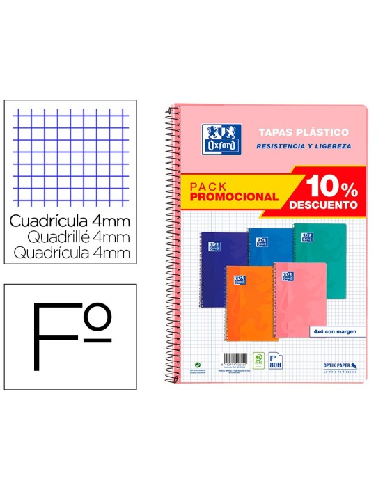 Cuaderno espiral oxford tapa plastico folio 80 hojas cuadro 4 mm pack 5 unidades colores tendecias