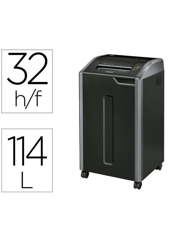 Destructora de gran capacidad recomendada para más de 10 usuarios. Capacidad de hasta 30-32 hojas. Corte en partículas de 4 x 30 mm. Nivel de seguridad P-4. Ancho de entrada: 305 mm. Sistema 100% antiatasco. Destruye grapas, clips, tarjetas de crédito y CDs. Sistema de seguridad SafeSense para evitar accidentes. Sistema de ahorro de energía. Sistema Auto-Oil que lubrica automáticamente las cuchillas mejorando su rendimiento. Ciclo de trabajo continuo. Papelera de 114 litros de capacidad.. Medidas: 558 x 946 x 508 mm. Peso: 68,5 kg.