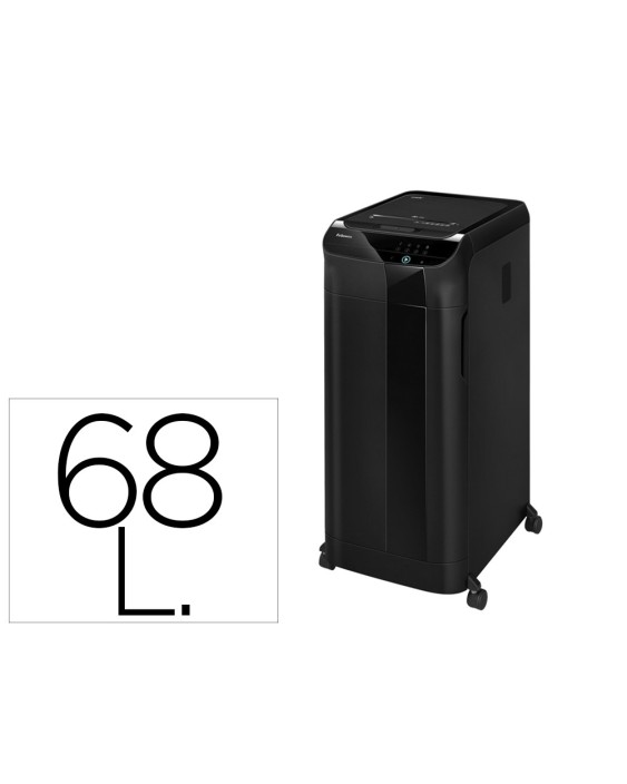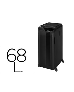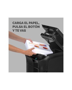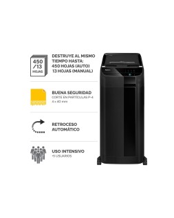 Destructora Automática deal para entornos de oficina de más de 5 usuarios que destruyen regularmente gran cantidad de papel. Capacidad de destruciónautomática de 450 hojas y manual de 13 hojas. Destruye documentos en part ículas de 4x38 mm (Nivel DIN P-4). Destruye la capacidad de 450 hojas en aproximadamente 10 minutos con un ciclo de trabajo de 45 minutos. El sistema Smart Lock permite al usuario bloquear la destructora con un PIN de 4 dígitos para impedir el acceso a los documentos mientras se están destruyendo. Papelera extraíble de 68 litros/ 720 hojas. También destruye CDs y tarjetas de crédito y grapas y clips (alimentación manual) Medidas: 390x578x813 mm. Peso 31,8 kg.