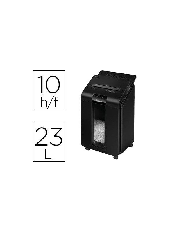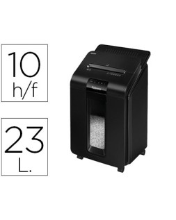 Destruye de forma automática hasta 100 hojas y de forma manual hasta 10 hojas. Tipo de corte en partículas de microcorte 4 x 10 mm. Nivel de seguridad P-4. Sistema antiatascos. Apagado automático. Ultrasilenciosa. Destruye también grapas, tarjetas de crédito y clips. Ciclo de trabajo 15 minutos. Papelera de 23 litros de capacidad. Medidas: 370 x 640 x 390 mm. Peso: 13,2 kg.