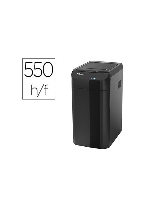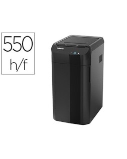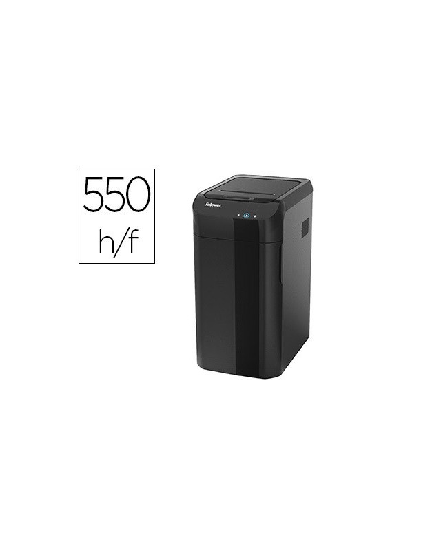 Destructora automática de ciclo continuo para uso de más de 5 usuarios. Capacidad de corte: hasta 550 hojas en partículas de 4 x 38 mm. Sistema antiatascos total Auto Reverse. Sistema de bloqueo con PIN de 4 dígitos. Entrada adicional de 230 mm para destruir manualmente pequeñas cantidades de papel (hasta 14 hojas). Admite casi todo tipo de papel (arrugado, impreso por 1 o ambas caras, papel Glossy, papel continuo,...). Sistema automático de reposo. Destruye clips, grapas, tarjetas de crédito y CD. Papelera extraíble de 83 litros de capacidad. Medidas: 441 x 890 x578 mm. Peso: 33,60 kg.