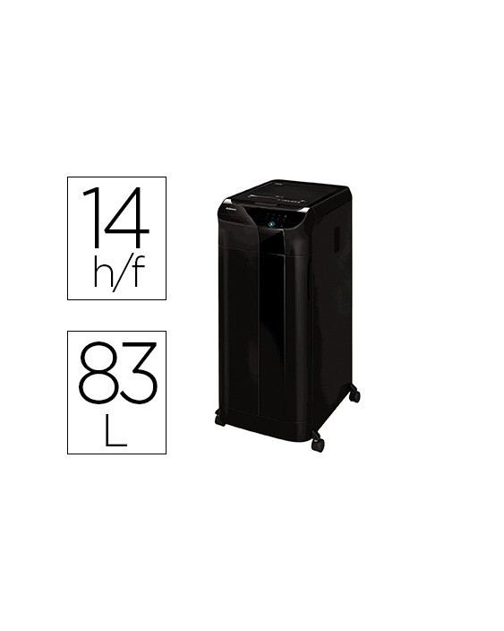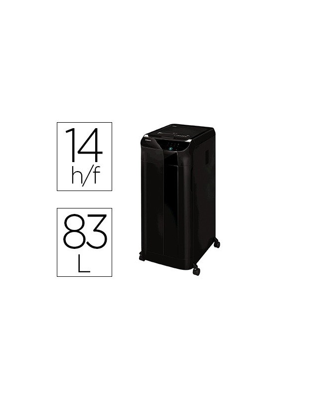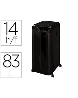 Destructora automática de alta seguridad. Destruye hasta 600 hojas de forma automática. Boca de entrada adicional de 230 mm para destruir manualmente hasta 14 hojas, tarjetas de crédito y hojas con clip. Sistema automático antiatasco auto-reverse para la destrucción, que hace retroceder las cuchillas si detecta un posible atasco. Sistema de bloqueo con PIN de 4 dígitos. Ciclo de trabajo continuo. Papelera extraíble de 83 litros de capacidad. Medidas: 441 x 890 x 578 mm. Peso: 31,79 kg.