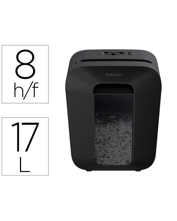 Capacidad de corte: 8 hojas. Corte en partículas de 4 x 37 mm. Nivel de seguridad P-4. Bloqueo de seguridad para evitar accidentes. Destruye de manera continua durante 6 minutos con un tiempo de enfriamiento de 20 minutos. Destruye grapas, clips y tarjetas de crédito. Papelera con capacidad para 17 litros. Medidas: 401 x 310 x 220 mm. Peso: 4,1 kg.