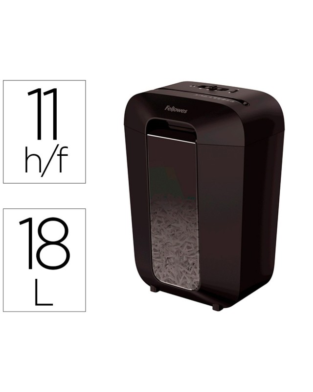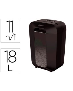 Destructora de uso ocasional para el hogar y la oficina. Capacidad de corte hasta 11 hojas en partículas de 4 x 40 mm. Nivel de seguridad P-4. Bloqueo de seguridad para evitar posibles accidentes. Ciclo de trabajo: 5 minutos. Destruye grapas, clips y tarjetas de crédito. Papelera de 18 litros de capacidad con cabezal fácilmente extraíble. Medidas: 310 x 220 x 460 mm. Peso: 5,3 kg.