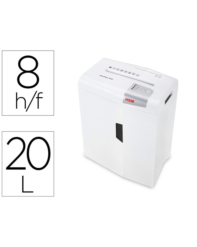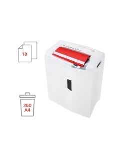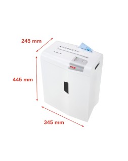 Protección de datos profesional y silencioso en el lugar de trabajo. Capacidad de corte: 10 hojas en partículas de 4,5 x 30 mm. Nivel de seguridad P-4. Destruye grapas, CD, clips y tarjetas de crédito. Mecanismo de corte independiente para CD. Indicador LED y de nivel. Inicio/paro automático con célula fotoeléctrica. Vaciado fácil. Ancho de entrada: 220 mm. Papelera de 20 litros. Medidas: 345 x 445 x 245 mm. Peso: 6 kg.