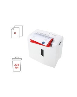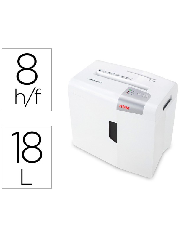 Eficiente, silenciosa, segura y con una convincente relación precio-rendimiento. Capacidad de corte: 8 hojas en partículas de 4,5 x 30 mm. Nivel de seguridad P-4. Papelera de 18 litros. Destruye grapas, CD, clips y tarjetas de crédito. Mecanismo de corte independiente para CD. Función antiatasco de papel. Indicador LED y de nivel. Inicio/paro automático con célula fotoeléctrica. Vaciado fácil. Ancho de entrada: 220 mm. Medidas: 385 x 345 x 245 mm. Peso: 4,8 kg.