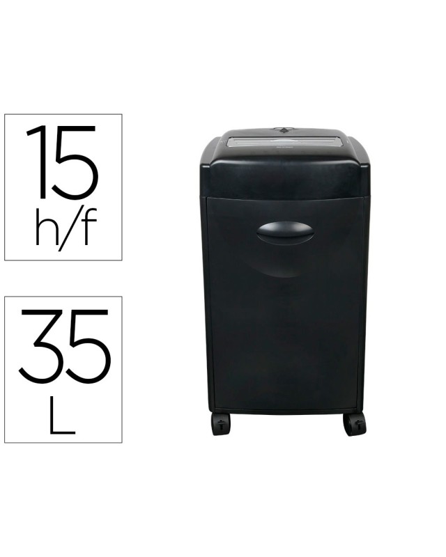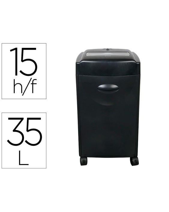 Capacidad de corte: 15 hojas. Corte en partículas de 4 x 30 mm. Ancho de entrada: 225 mm. Nivel de seguridad P-4. Arranque y parada automáticos. Marcha atrás para eliminar atascos. Protección contra sobrecalentamiento. Destruye grapas, clips y tarjetas de crédito y CD. Papelera de 35 litros. Medidas: 381 x 653 x 325 mm. Peso: 14,7 kg.