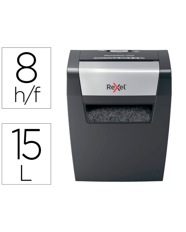 ¡La potencia para destruir más! La destructora de papel Rexel Momentum X308 destruye hasta 8 hojas de una vez, funciona ininterrumpidamente durante 3 minutos y es ideal para uso doméstico. P3, corte cruzado (partículas de 5 × 42 mm). Papelera de 15 l de capacidad (100 hojas A4).