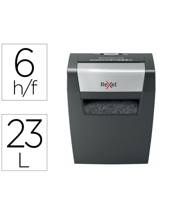 La destructora de papel Rexel Momentum X406 destruye hasta 6 hojas de una vez, funciona ininterrumpidamente durante 3 minutos y es ideal para uso doméstico. P4, corte en confeti (partículas de 4 × 30 mm). Papelera de 15 l de capacidad (125 hojas A4).