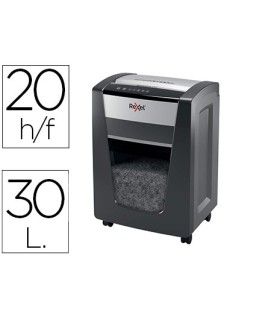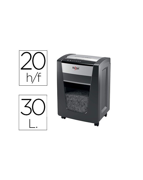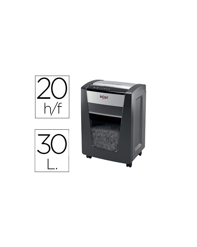 La potencia para destruir más. La destructora de papel REXEL momentum x420 destruye hasta 20 hojas de una vez, funciona ininterrumpidamente durante 4 horas y es ideal para oficinas pequeñas. La tecnología antiatasco del modelo x420 garantiza el funcionamiento ininterrumpido. p4, corte cruzado (partículas de 4 × 40 mm.). Trituradora silenciosa con botones táctiles sencillos e intuitivos y una generosa papelera de 30 litros de capacidad (275 hojas A4).