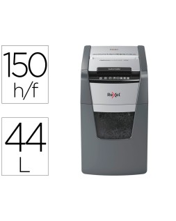 La destructora de corte en partículas. Tritura automáticamente hasta 150 hojas de papel DIN A4 (80 g/m²) a la vez, nivel de seguridad P-4. Esta destructora de alimentación automática es una trituradora de oficina sofisticada, con una papelera extraíble de 44 litros. No es necesario alimentar manualmente el papel, ni quitar grapas y clips de papel primero, esta destructora de papel automática hará todo el trabajo por ti. Medidas: 365 x 618 x 430 mm. Peso: 15,34 kg.