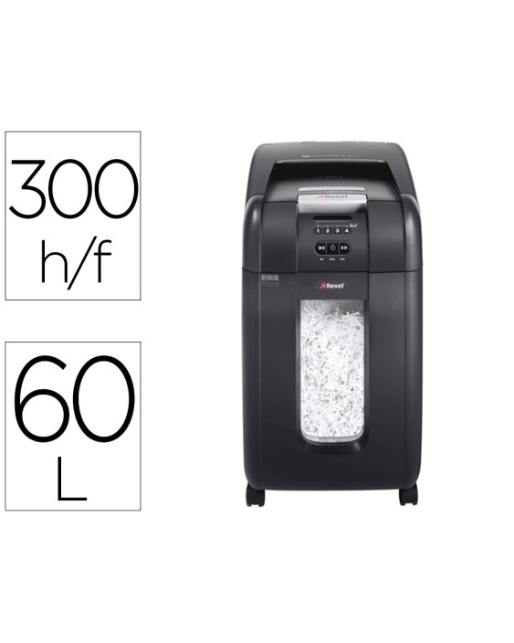 Destructora de corte en partículas. Tritura automáticamente hasta 300 hojas de papel DIN A4 (80 g/m²) a la vez y hasta 10 hojas manualmente. Nivel de seguridad P-4. Esta destructora de alimentación automática es una trituradora de oficina sofisticada, con una papelera extraíble de 60 litros. No es necesario alimentar manualmente el papel, ni quitar grapas y clips de papel primero. Medidas: 415 x 806 x 465 mm. Peso: 21 kg.
