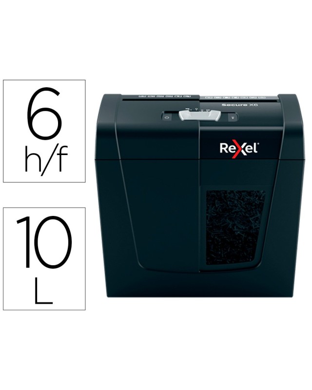 La gama de destructoras de papel Secure de Rexel es ideal para destruir sus documentos personales e información confidencial en casa. La máquina destructora Secure X6 destruye hasta 6 hojas de papel A4 (80 grs) de una sola vez a través de la ranura de alimentación manual en partículas de nivel de seguridad P-4 (4x40 mm). Esta pequeña destructora de corte en partículas es perfecta para usar como destructora doméstica en una oficina en casa, o también es una destructora de oficina personal ideal que se adapta cómodamente debajo de un escritorio debido a su tamaño compacto y adecuado. Diseñada para un uso de esporádico a moderado con una capacidad de papelera de 10 litros.
