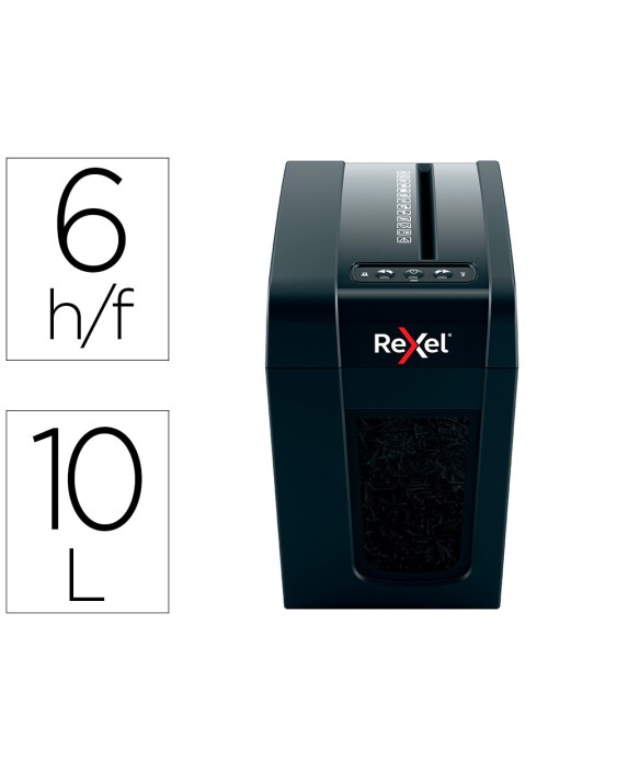 Capacidad de corte: 6 hojas a la vez. Corte en partículas de 4 x 40 mm. Nivel de seguridad P-4. Destruye grapas y clips. 6 minutos de funcionamiento continuo. Función de avance/retroceso manual y automático. Luz LED de sobrecalentamiento. Papelera de 10 litros. Color negro. Medidas: 190 x 280 x 330 mm. Peso: 3,9 kg.