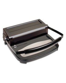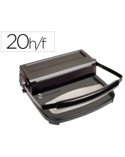 Encuadernadora manual de espiral de plástico o metálica. Perfora hasta 20 hojas de 80 g/m² con tamaño máximo de folio apaisado. Encuaderna hasta 450 hojas. Espiral de 50 mm. Paso de la espiral 5:1. Escala de perforaciones serigrafiada y tope lateral. Palanca en U con goma para facilitar la perforación. Medidas: 420 x 345 x 200 mm. Peso: 15 kg.