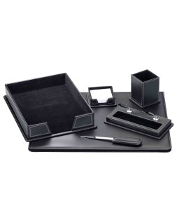 Juego de escribanía y accesorios para sobremesa. Fabricado en símil piel. Contiene 6 piezas: vade doble plegado al centro, abrecartas, soporte para taco de papel, cubilete portalápices, portabolígrafos y bandeja portadocumentos. Color negro. Medidas: 500 x 400 x 10 mm.