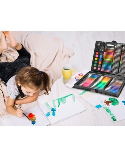 Conjunto de dibujo y coloración: elementos esenciales creativos para dibujar, colorear y hacer en cualquier momento y en cualquier lugar. Contenido: rotuladores de colores, lápices de colores, ceras de colores, colores de acuarelas, ceras blandas de colores, clips, lápiz, pincel, pegamento, goma, sacapuntas, tijera, regla, paleta y COLA BLANCA.