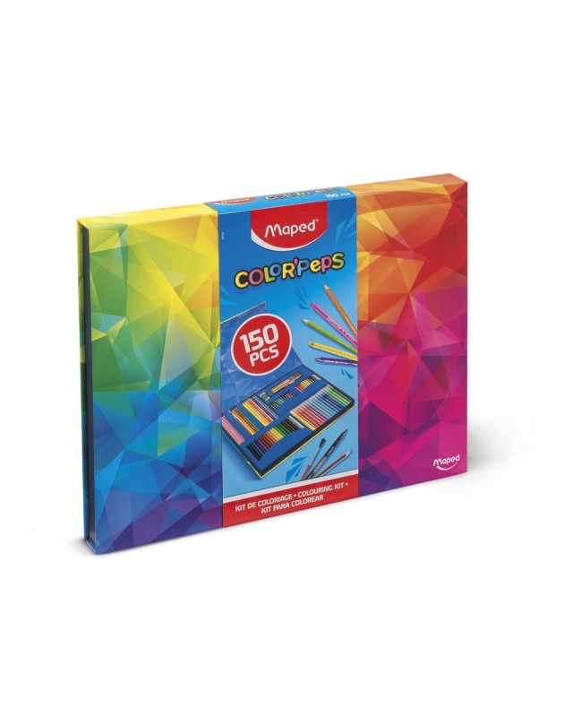 Kit de coloreado de 150 piezas. Contiene: 36 rotuladores lavables con punta media, 36 lápices de color de resina, 3 lápices de color Duo colores carne, 12 lápices de color Pastel, 14 lápices de color acuarelables, 1 pincel, 20 lápices de color Infinity, 24 ceras Wax, 1 rotulador de purpurina, 1 lápiz de grafito, 1 goma, y 1 sacapuntas.