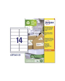 Etiquetas adhesiva blancas Avery en papel blanco, ecológicas realizada en papel reciclado al 100% y certificado FSC. El color blanco es muy parecidoa las etiquetas tradicionales. Adhesivo permanente. Nueva tecnología ultr agrip, agarre seguro sin atascamientos para impresiones perfectas. Cuenta la tecnología QuickPeel, simplemente se divide la hoja a lo largo de la perforación para separar las esquinas de las etiquetas, se remueve y se aplica. Para impresoras láser. Utiliza el software crea e imprime gratuito de Avery para realizar el diseño de las etiquetas con pocos clics. Medidas: 99,1x38,1 mm. Caja de 25 hojas A4. 210 etiquetas por caja.