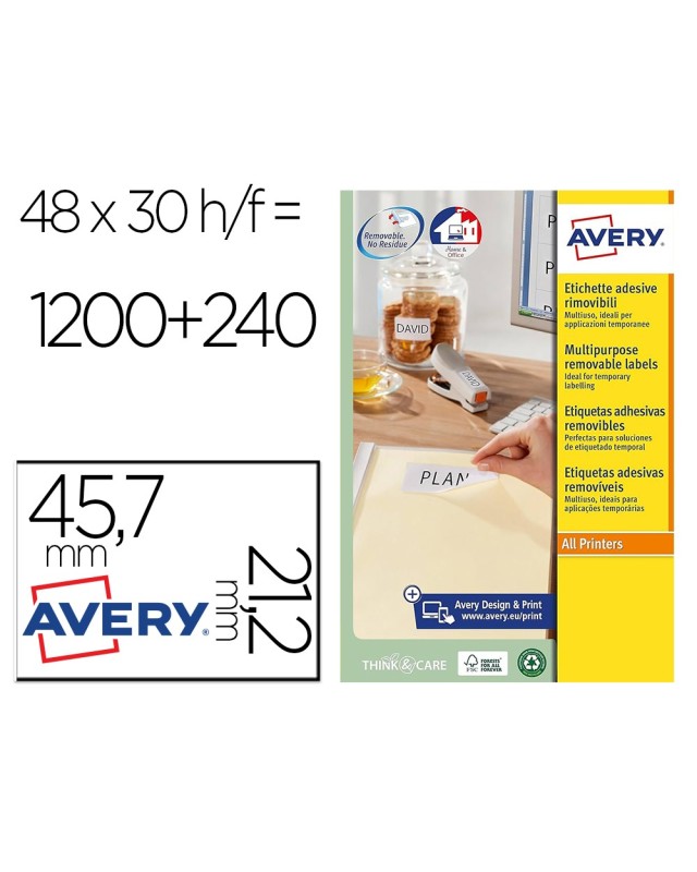 Etiqueta adhesivas Avery en papel blanco, adhesivo removible. Gracias al adhesivo removible, cuando se quitan, no dejan residuos de pegamento en lassuperficies. Ideales para soluciones de etiquetado temporaneo y para cerr ar los paquetes de comida para llevar. Ecológicas, realizadas con papel certificado FSC procedente de bosques gestionados de forma responsable. Se puede utilizar el software crea e imprime gratuito de Avery para realizar el diseño de las etiquetas con pocos clics. Para impresoras láser, inkjet yfotocopiadoras. Medidas: 45,7x21,2 mm. Caja de 25 hojas A4. 1200 etiqueta