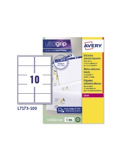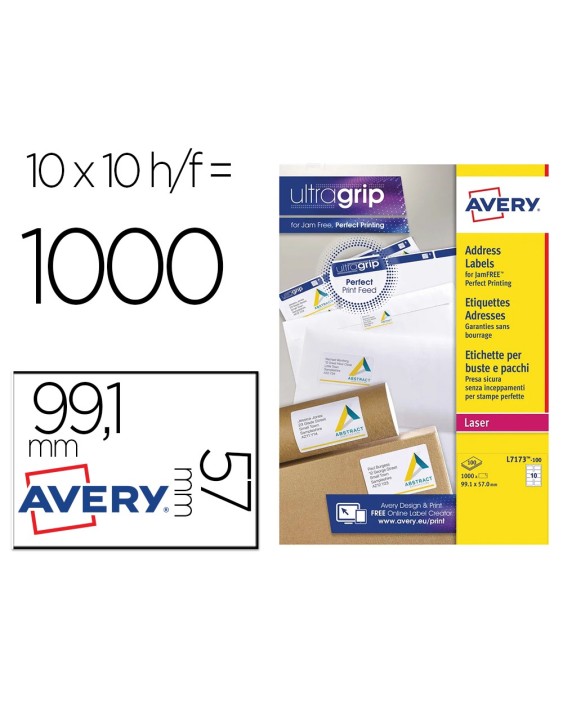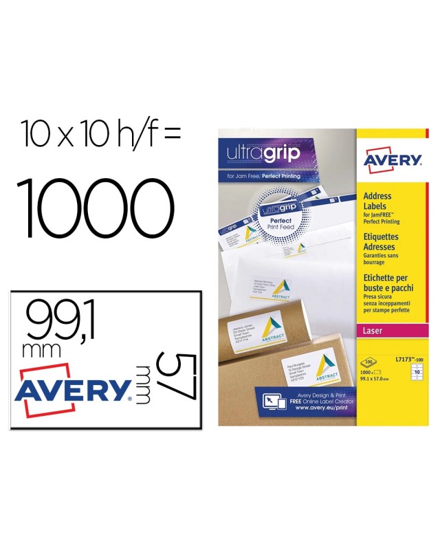 Etiquetas blancas de papel con adhesivo permanente. Para copiadoras, fotocopiadoras e impresoras inkjet y láser. Garantía jam free. Forma rectangular. Esquinas rectas. Indicadas para escribir direcciones o como tarjetas devisita. Cuenta la tecnología QuickPeel, simplemente se divide la hoja a l o largo de la perforación para separar las esquinas de las etiquetas, se remueve y se aplica. ecológicas y reciclables. Certificado FSC. Formato DinA4. Medidas: 99,1 x 57 mm. Etiquetas por caja: 1.000. Etiquetas por hoja: 10. Caja con 100 hojas. Se puede utilizar el software crea e imprime grat uito de Avery para realizar el diseño de las etiquetas con pocos clics.