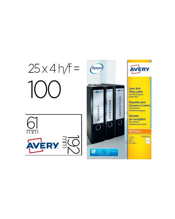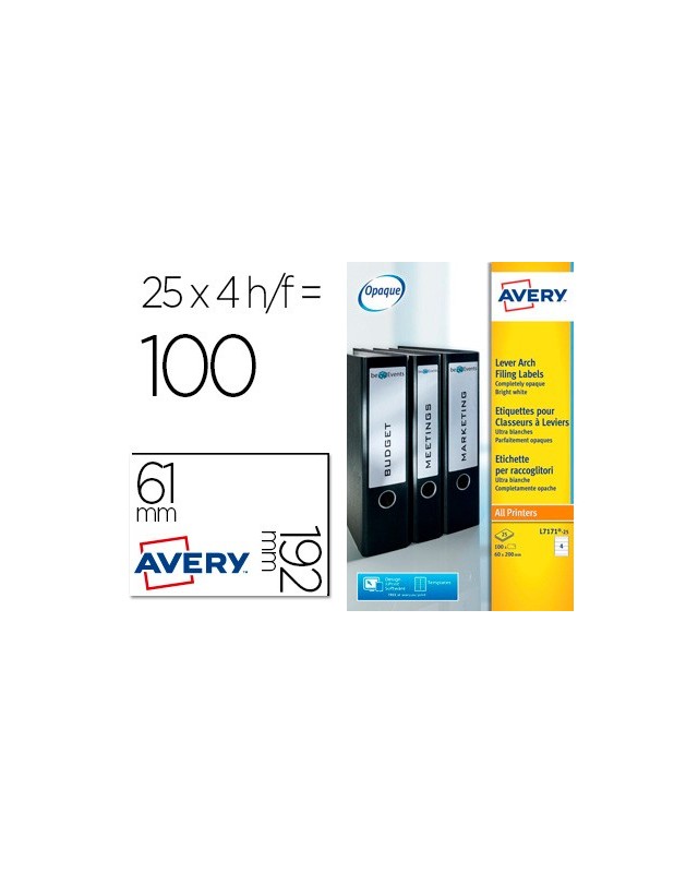 Etiquetas blancas de papel con adhesivo permanente y cubriente. Ideales para etiquetar cajas de archivo. Nueva tecnología ultragrip, agarre seguro sin atascamientos para impresiones perfectas. Gracias a la tecnología blockout, al especial material cubriente permite ocultar la etiqueta anterior. Color blanco Para lomo ancho de 6 cm. Caja de 20 hojas. Se puede utilizarel software crea e imprime gratuito de Avery para realizar el diseño de l as etiquetas con pocos clics.