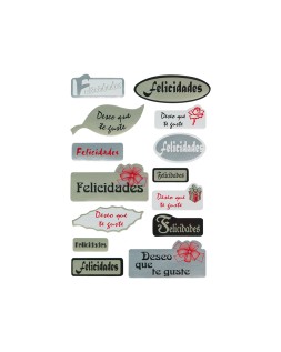 - Etiquetas adhesivas felicidades: Un clásico que nunca falla, disponible en distintos tamaños y estilos.
