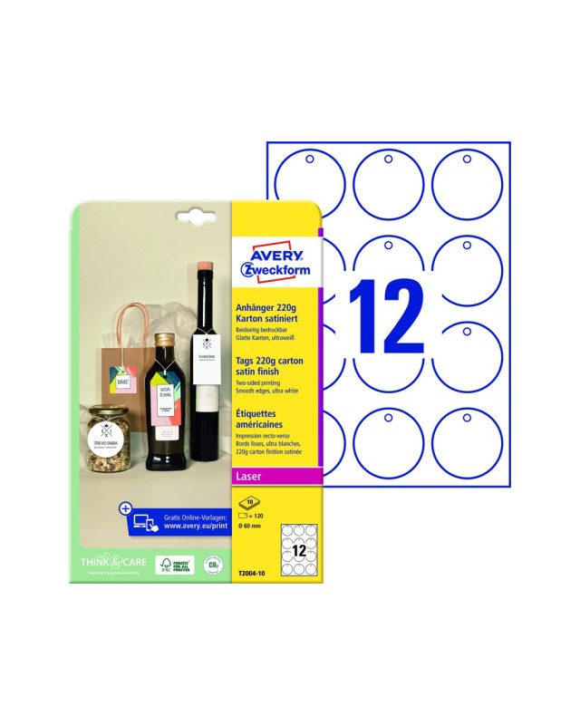 Etiquetas colgantes imprimibles de cartón de 220 gr, bordes lisos, redondos Ø 60mm, blancas, sin adhesivo. 12 etiquetas colgantes por hoja, láser, imprimibles por las dos caras, certificadas FSC, incluye el hilo para colgarlos. 10 hojas por caja. Perfectas para identificar productos artesanales, botellas, prendas de vestir, cajas de regalo.