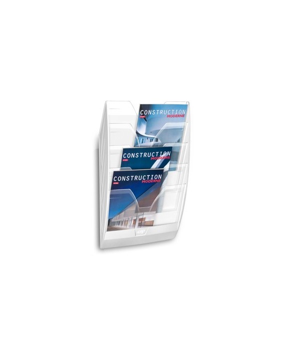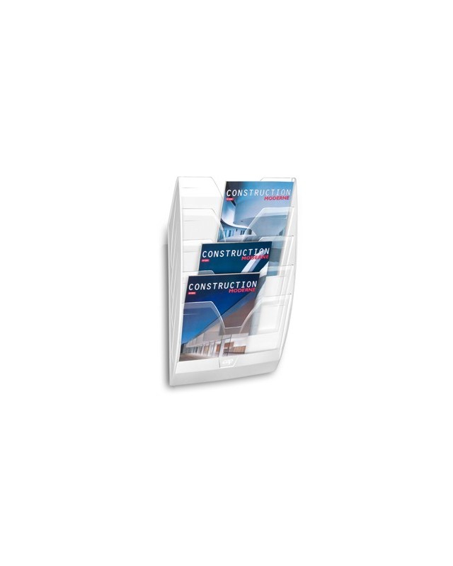 Elegante expositor mural. Compuesto por 5 separadores móviles transparentes. Colores blanco y transparente. Acepta documentos grandes y de formatos superiores a 24 x 32 cm. El conjunto soporta grandes cargas de peso. Se pueden constituir varios módulos yuxtaponiéndolos. Entregado con kit de fijación. Medidas útiles de una casilla: 32,5 x 2,6 cm. Medidas: 35 x 58 x 12,2 cm.
