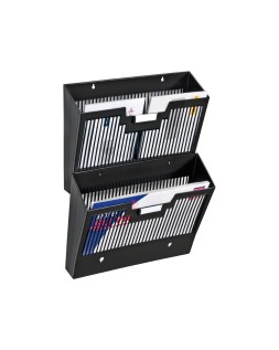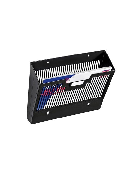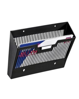 Expositor de rejilla de gran capacidad para documentos DIN A4 y folio. Acoplable en vertical. Con portaetiquetas central. Apertura ancha para fácil acceso. Equipado con un soporte de etiqueta central, para poder unir las cestas en grupos o por separado. Fabricado en poliestireno reciclable de alto impacto. Color negro. Medidas: 25,7 x 36 x 9,5 cm.