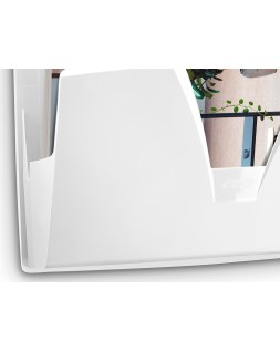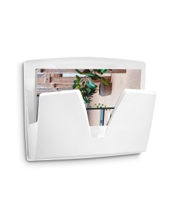 Expositor de pared con propiedades antibacterianas. La adición de un agente bactericida de iones de plata elimina la presencia y el crecimiento de las bacterias de por vida. Permite guardar documentos de hasta 24 x 32 cm. Muescas en los laterales para insertar formatos muy grandes (DIN A3+), tubos de dibujo... Amplia apertura en forma de V para un excelente agarre de los documentos. Kit de fijación suministrado (tornillos, tacos). Soporta una carga de 2,5 kg. PS resistente, 100% reciclable. Color: blanco ártico. Medidas: 36,1 x 27 x 8,6 cm.