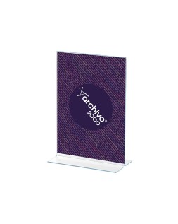Expositor sobremesa Archivo 2000 Premium ultra transparente en forma de T DIN A3 vertical Espesor 2 mm. Fabricado en poliestireno ultra transparentede gran calidad y resistencia. El documento se introduce por la parte inf erior. Amplia base que lo hace muy estable. Fabricación española. Medidas exteriores: 115x300x425 mm.