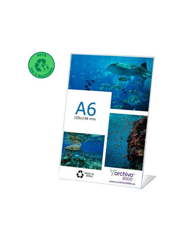 Expositor de sobremesa en forma de L flexibles Archivo 2000 DIN A6 vertical. Fabricados en PET, libre de PVC. 100% reciclable. Alta resistencia a impacto, desgaste o rotura. Color cristal transparente. Medidas exteriores: 45x105x150 mm. Fabricados en España.