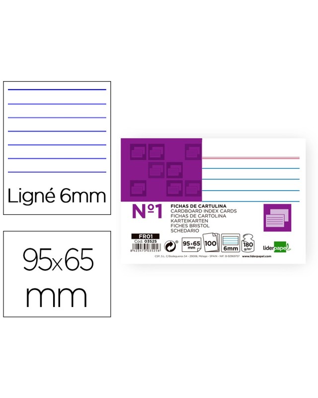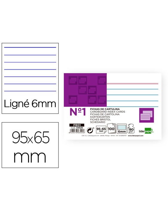 Ficha liderpapel rayada nº1 65x95 mm 180g/m2 paquete de 100 unidades
