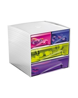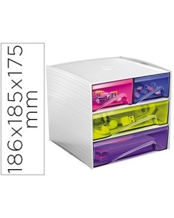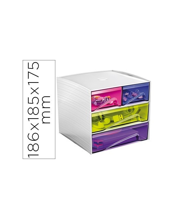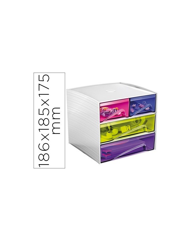 Módulo de cajones apilables fabricado en poliestireno 100% reciclable. Apilable. Su ingenioso y compacto diseño, lo hace ideal para almacenar y recoger pequeños accesorios y material de oficina. Los cajones están equipados con topes de retención y mangos ergonómicos. Con almohadillas antideslizantes incluidas. 4 cajones. Multicolor. Medidas: 186 x 185 x 175 mm. No incluye accesorios.
