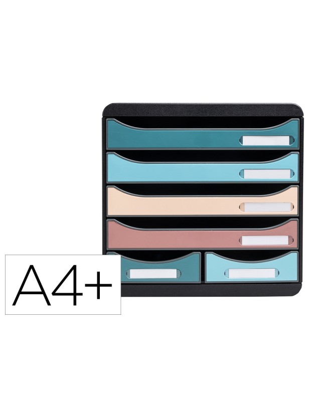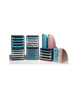 Módulo Big Box Maxi Skandi con 6 cajones (4 grandes y 2 estrechos). Para documentos A4+ en los cajones grandes. Colores surtidos de los cajones con cuatro colores modernos tonos naturaleza. Los cajones abiertos permiten colocar directamente documentos sin manipular el cajón. Fabricado con material de plástico reciclados, certificado Ángel Azul. Medidas: 347x278x271 mm.