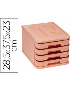 Mueble de plástico, fabricado en poliestireno, con cuatro cajones de colorverde pastel de 5 cm. para guardar documentos, con sistema de bloqueo, qu e evita la salida de los mismos. Con portaetiquetas en cada cajon. Diseñado para apilarse de forma vertical formando un sólido bloque. Exterior gris, con dos tapas decorativas. Medida exterior: 285x375x230 mm. 100% Reciclable.