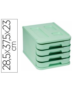 Mueble de plástico, fabricado en poliestireno, con cuatro cajones de colorvioleta pastel de 5 cm. para guardar documentos, con sistema de bloqueo, que evita la salida de los mismos. Con portaetiquetas en cada cajon. Diseñado para apilarse de forma vertical formando un sólido bloque. Exterior gris, con dos tapas decorativas. Medida exterior: 285x375x230 mm. 100% Reciclable.