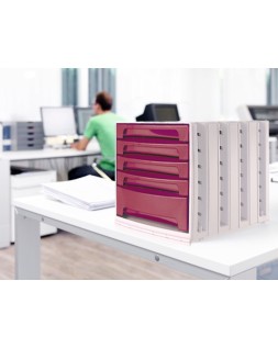 Módulos de cajones apilables y con tope de seguridad para evitar que se caigan al abrirlos. Suave deslizamiento. Agujero en la base para una fácil extracción de los documentos. Acepta documentos de hasta 270 x 320 mm. Incluye bandeja organizadora en la parte superior para tener siempre a mano los accesorios de oficina. Su diseño ergonómico y funcional facilita un apilamiento muy estable con la simple colocación de un módulo sobre otro. Medidas: 305 x 215 x 370 mm.