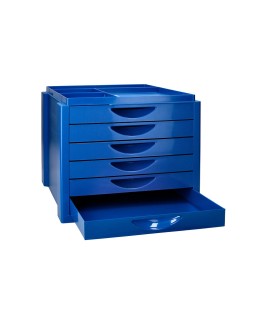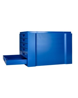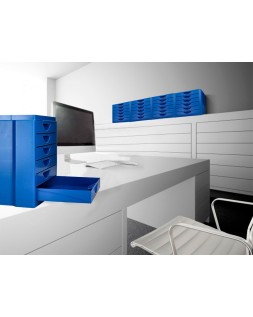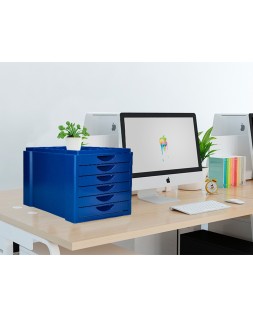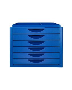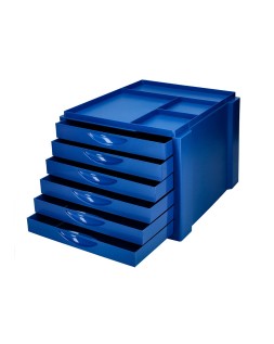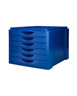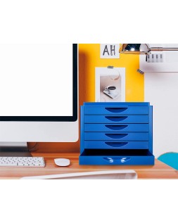 Módulo de sobremesa con carcasa gris y 6 cajones. Fabricado en poliestireno de gran calidad y resistencia. Apilable. Cajones con tope de seguridad y suave deslizamiento. Válido para formatos DIN A4, folio y subcarpetas. Incluye bandeja organizadora con 4 compartimentos en la parte superior para tener siempre a mano los accesorios de oficina. Medidas: 350 x 255 x 280 mm.