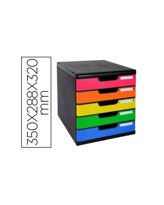 Clasificador individual de cajones para DIN A4+. Superponible. Deslizamiento perfecto de los cajones, con un stop de seguridad y portaetiquetas con etiquetas suministradas. Color negro con cajones arlequín, cada cajón tiene un color diferente que lo hace más moderno y permite identificar con más facilidad los documentos.
