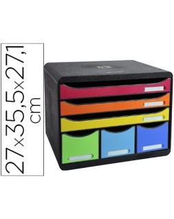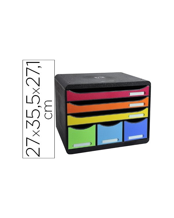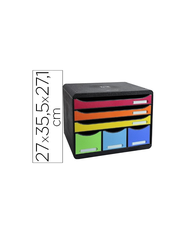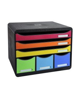 Clasificador individual de cajones para DIN A4+. Superponible. Deslizamiento perfecto de los cajones, con un stop de seguridad y portaetiquetas con etiquetas suministradas. Color negro con cajones arlequín, cada cajón tiene un color diferente que lo hace más moderno y permite identificar con más facilidad los documentos.