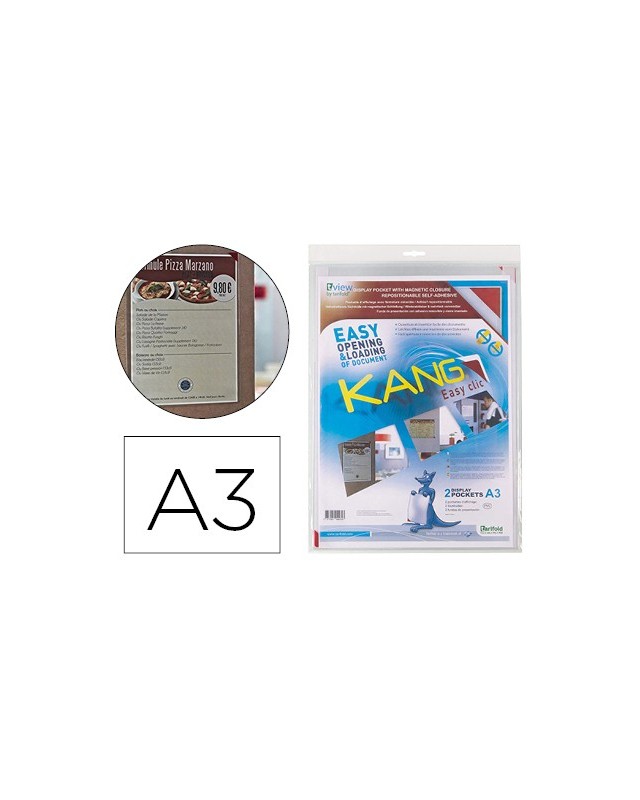 Funda en PVC con adhesivo reposicionable en el dorso y cierre por esquina imantada roja. Capacidad: hasta 10 hojas de 80 g/m². Se lee por ambas caras. Ideal para superficies lisas: escaparates, puertas, pared, metal, etc. No deja residuos. Vertical / horizontal.