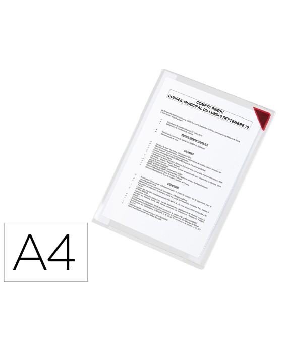 Funda en PVC con adhesivo reposicionable en el dorso y cierre por esquina imantada roja. Capacidad: hasta 10 hojas de 80 g/m². Se lee por ambas caras. Ideal para superficies lisas: escaparates, puertas, pared, metal, etc. No deja residuos. Vertical / horizontal.
